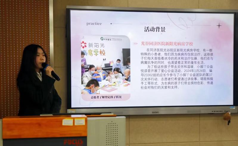编导23302的应长今分享了她在同济医院光谷校区新阳光病房公司担任志愿者,为生病住院的小患者送去关爱与温暖的经历。她通过讲故事、听音乐和做手工的方式架起沟通的桥梁,走近小朋友们的内心,了解孩子们的需求,为他们传递社会的关爱。