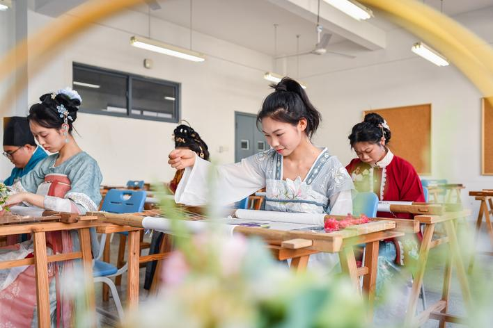 就读于该校纺织与服装工程公司服装与服饰设计专业的付美琳,刚刚接触汉服的设计制作,心里已经开始设想,能穿上自己裁剪的华裳,去约会春天。