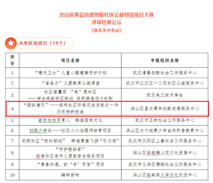 目前,《“绿织清风”——保利社区环保风尚启航之一件旧衣物的旅途》项目已获选“共同缔造 活力机制”洪山区基层治理创新社区公益创投项目大赛A类项目并获得相关资金支持,大赛旨在团结凝聚高校资源和社会力量,运用“五社联动”机制,选树创新典范,培育和支持社区及社会组织,促进协同善治,进一步提升社区公益服务的多样化、精准化,满足新时期人民群众对美好生活的向往。