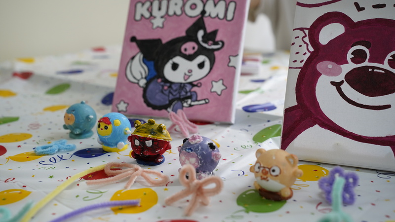 另一组同学在网播23303班赵家佳同学的带领下,用细腻的笔触、丰富的色彩在油画和石膏娃娃上自由创作。在活动过程中,大家彼此分享自己最近的困惑压力以及快乐时刻,共同欣赏由大家创作的手工作品,活动在欢声笑语中落下帷幕。