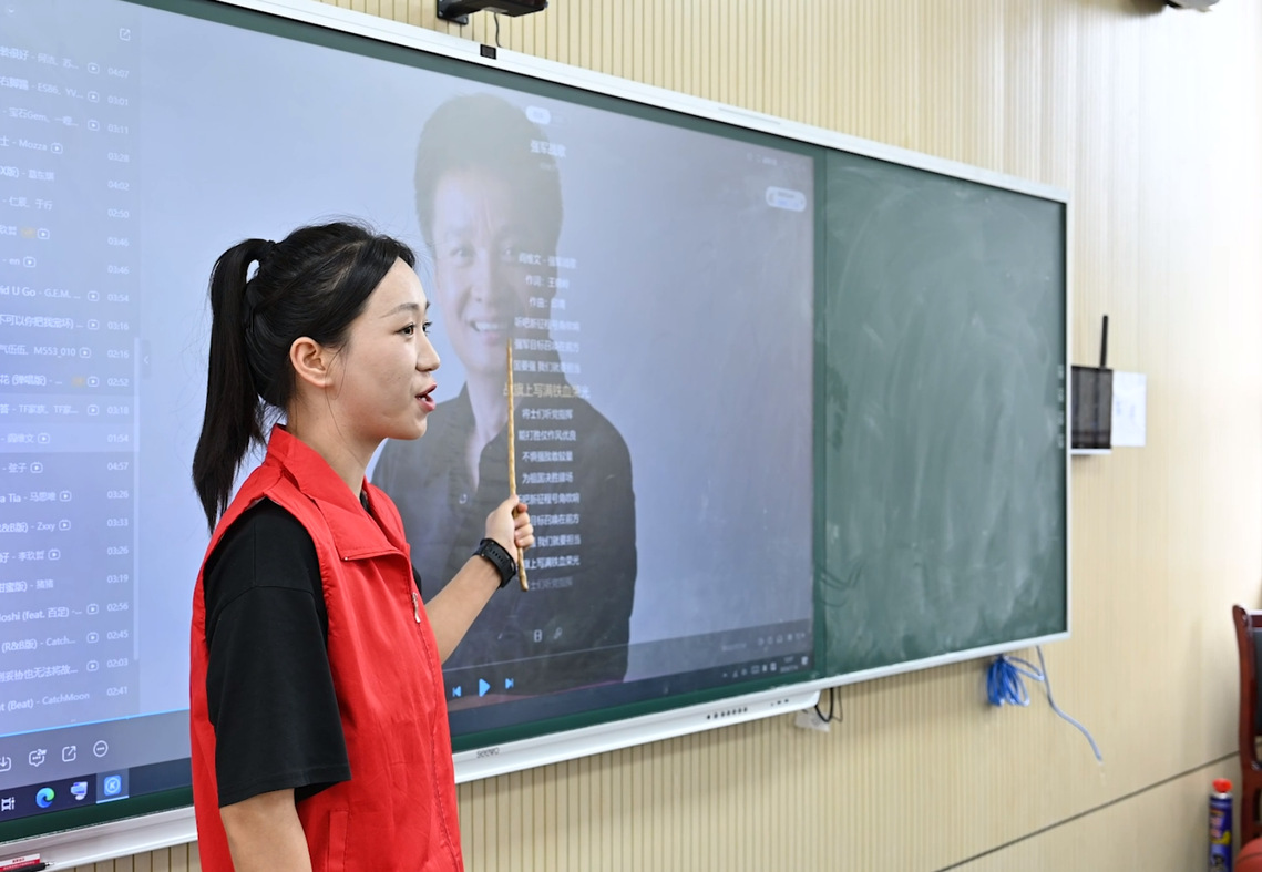 实践团将爱国主义教育的内核寓于普通话教育的形式之中,与青少年共上一堂“行走的思政课”。在实践团成员带领下,孩子们学唱《我和我的祖国》《红旗飘飘》《强军战歌》等经典红歌,巩固字音的同时在心中埋下爱国主义的种子。
