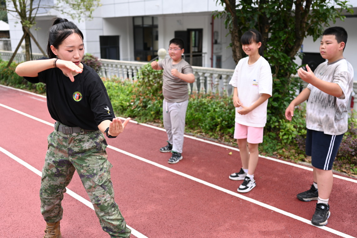 “晓庆姐姐,教我们几招防身术吧!我长大以后也想穿上帅气的军装,成为保护国家的大英雄!”烈日炎炎下,“红领巾”和“橄榄绿”双向奔赴,退伍复学特战女兵李晓庆为小朋友们上了一堂别开生面的“军营体验课”,通过站军姿、敬军礼、走正步,示范格斗术,普及急救知识,让孩子们“零距离”感受军营独特魅力,在推普行动中培养青少年爱国情怀和国防意识。