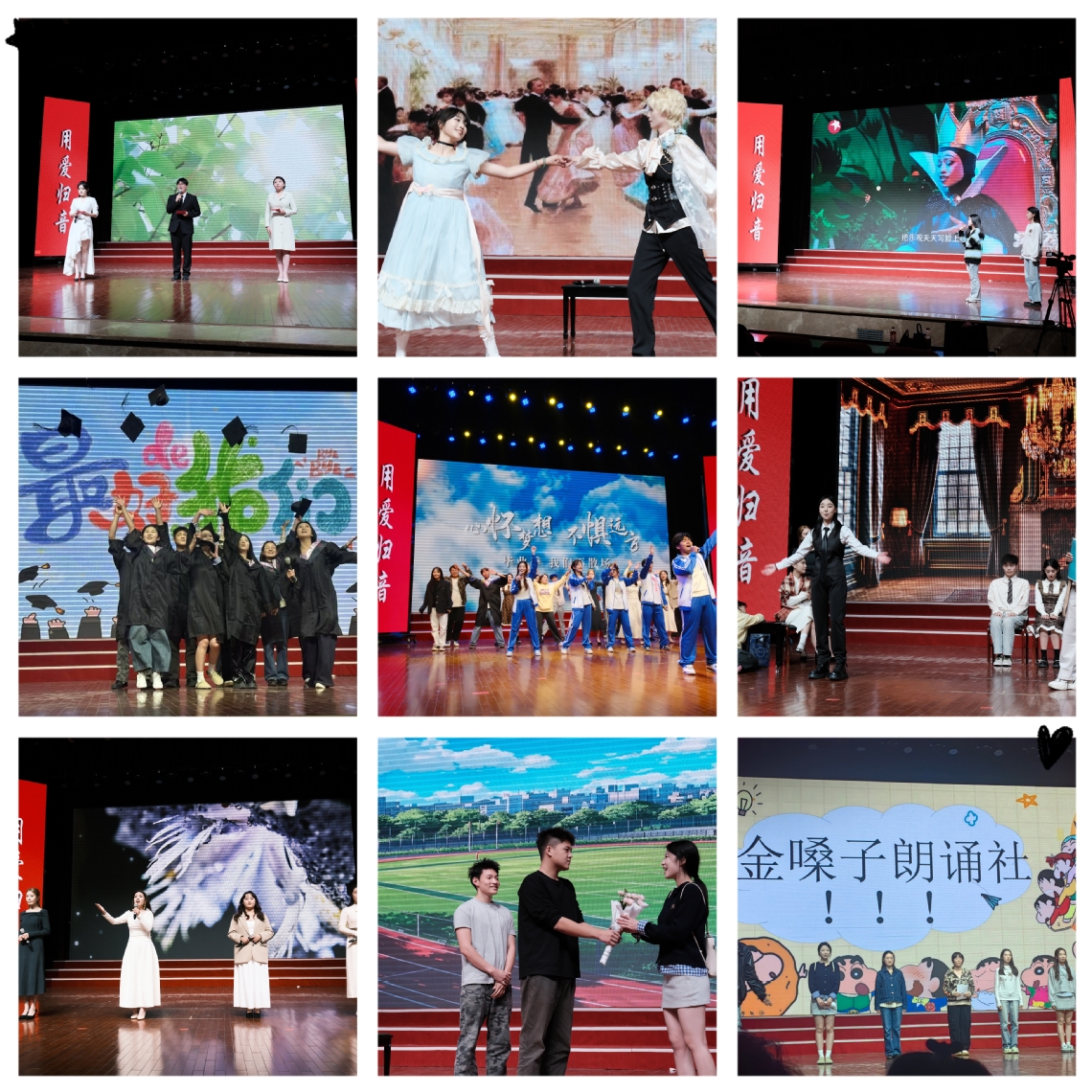 在第篇章“青春飞扬”主题展演中诗歌朗诵《青春礼赞》《会唱歌的鸢尾花》展现朗诵者对青春的颂扬与对美好生活的向往配音节目《白蛇》、《茶话会》配音舞台剧《我是灰姑娘》将观众带入一个充满传奇色彩和熟悉人物形象的声音世界小品《是谁杀死了周日》的幽默表演揭示了周日消失的真相,提醒人们珍惜时间朗诵《今天我想对你说》《最好的我们》,表达了播音主持专业员工对梦想的追求对未来的憧憬、对青春岁月的怀念与珍视。
