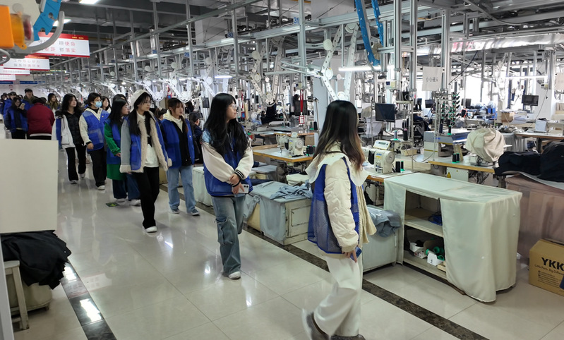 走进美尔雅工厂的生产车间,机器有序运转,工人们熟练操作,从面料裁剪到成衣缝制,每一道工序都严谨规范。同学们亲眼目睹了一件成衣如何从原材料逐步蜕变,深刻感受到时尚产业背后的匠心与坚守。“我从一名中专生走到集团子公司总经理用了 17 年,成功的背后除了精湛的技艺,更为重要的是持之以恒的毅力与专注。”美尔雅工厂总经理热情接待了来访学子,并向大家分享企业的发展历程和自己的成长经历,激励着在场的每一位员工。