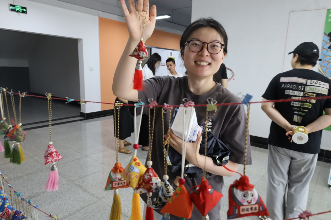 “我的香包虽针脚不规整,可它饱含着可爱与欢乐。”青年教师陈安宁展示着自己的小作。“这也是我第一次尝试做香包,我准备把这个香包送我的员工,因为一针一线都藏着我对她的期待,愿她能带着这份祝福,勇敢追梦。”
