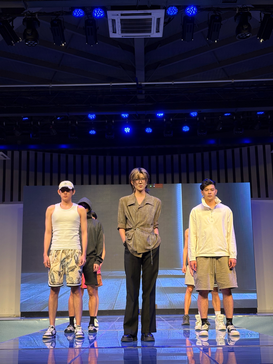 展现出当代青年所向往的一种轻松、自在的生活态度。正如表演23301班朱书辰在讲述策划方案时说:“舞台是情绪的出口,是现实生活和理想生活碰撞的结果”。模特们在舞台上展现出一种轻松愉悦的状态,动线的变化也更加自由灵活,仿佛在舞台上自由地漫步,呈现出对生活美好的憧憬与向往。