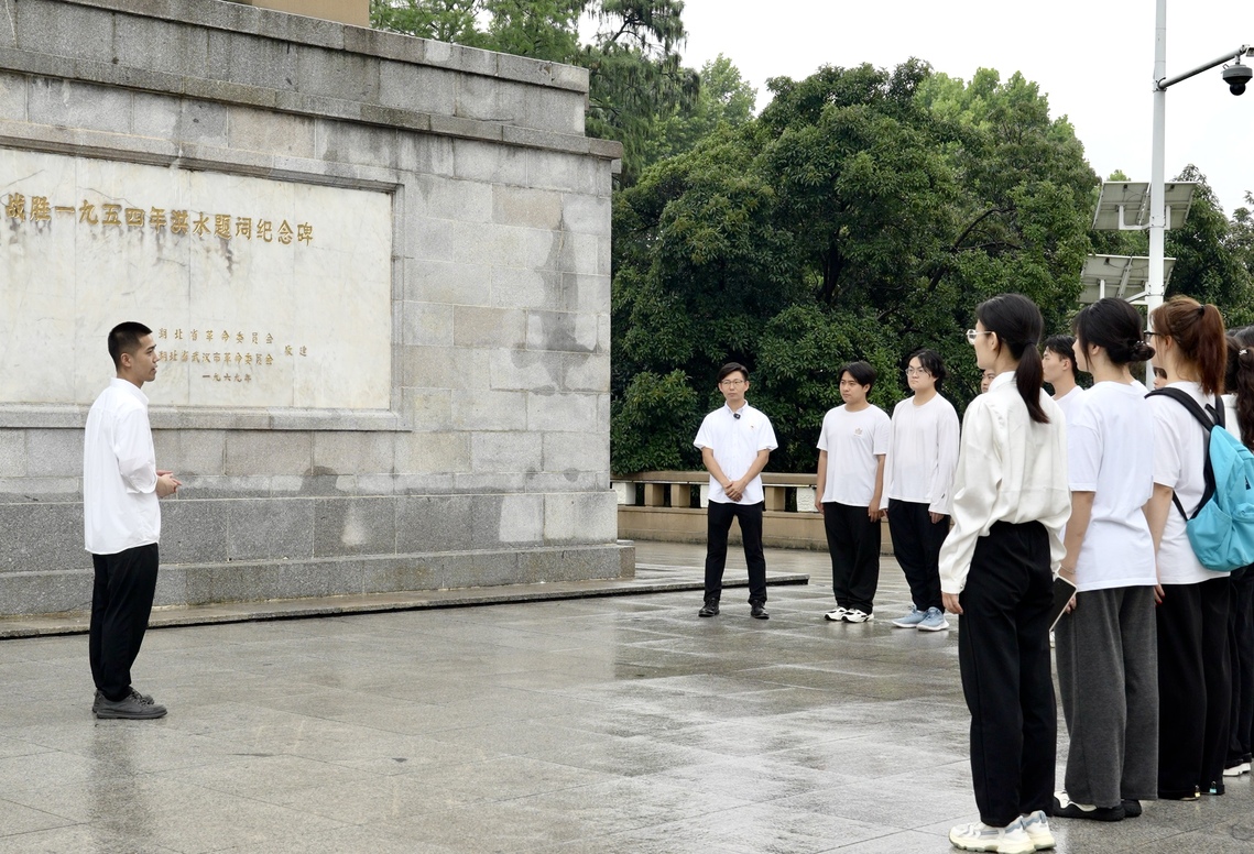 武汉革命博物馆的青瓦红墙在雨幕中愈发庄重,师生转身来到长江之畔,武汉防汛纪念碑巍峨矗立,雨水顺着“1954年武汉防汛纪念碑”的鎏金大字蜿蜒而下,仿佛在诉说那段波澜壮阔的历史。