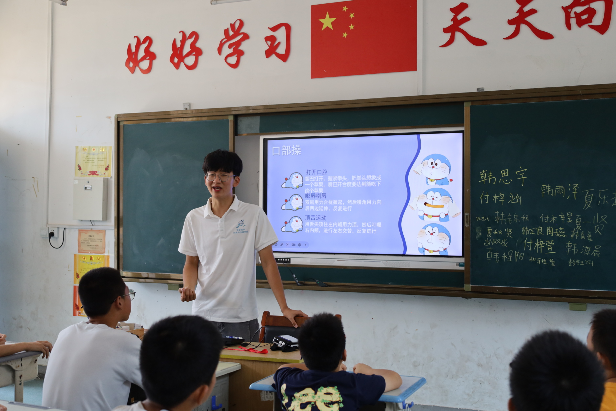 “小朋友们,跟着老师读:‘小竹排,顺水流,鸟儿唱,鱼儿游’……”在田铺大塆中心公司,实践队员朱奕宇正带着30余名孩子开展“趣味口才课”,通过绕口令、诗歌朗诵、红色故事角色扮演等形式,帮助孩子们克服“不敢说普通话”的羞涩。