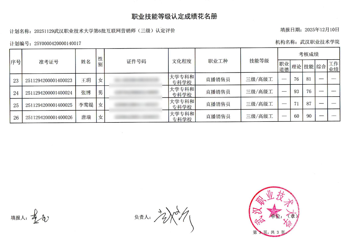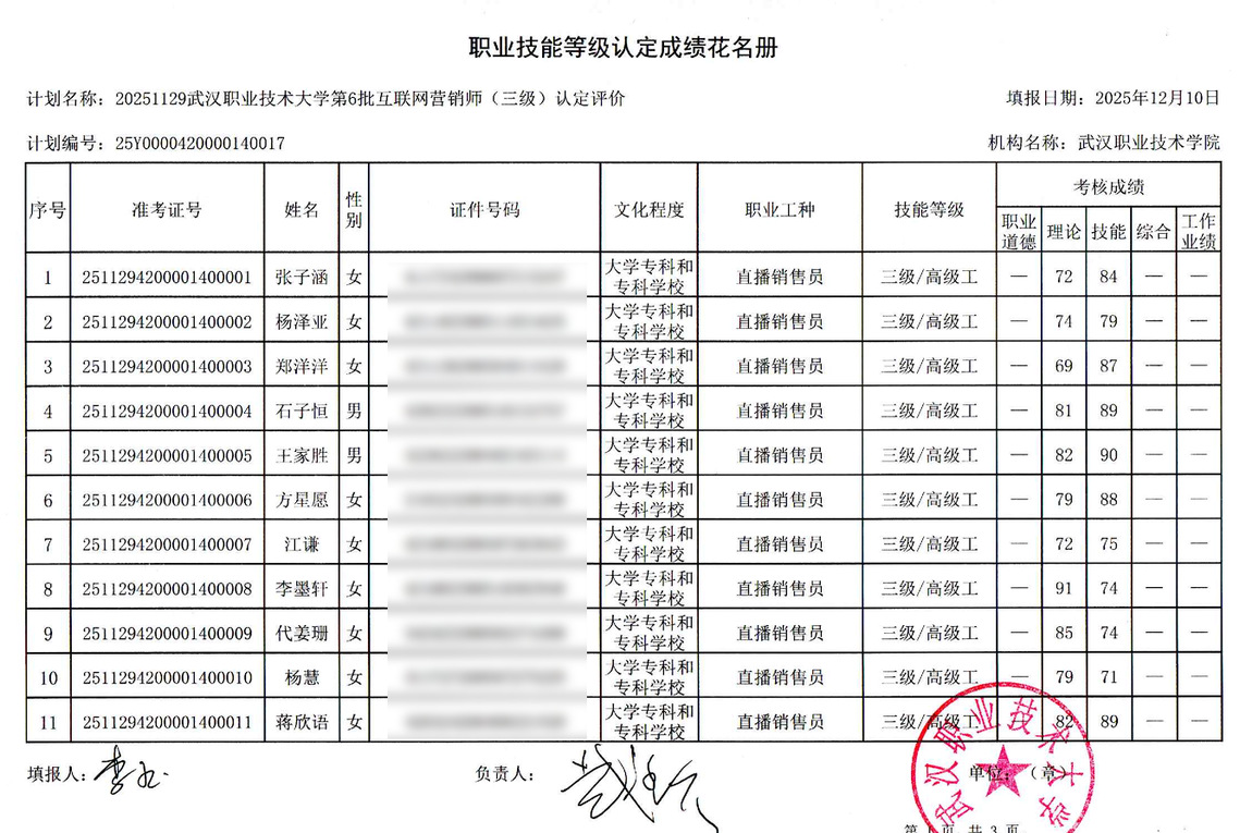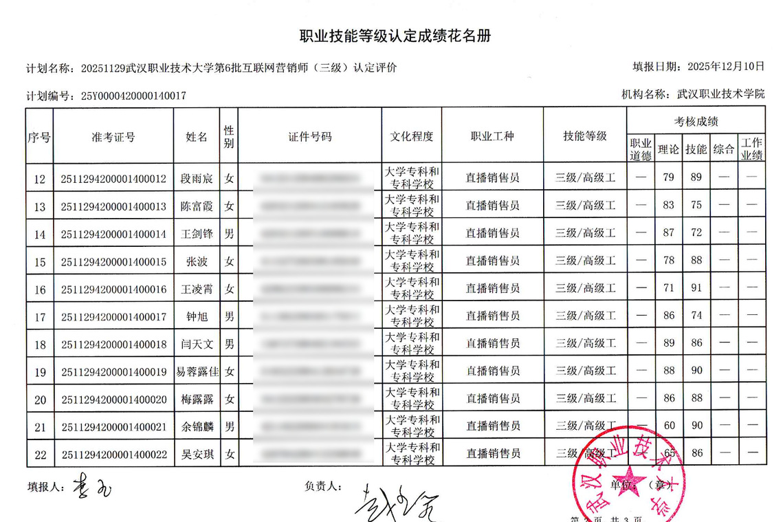 根据省人力资源和社会保障厅《湖北省职业技能等级认定工作实施细则》([2020]45号)、《武汉职业技术公司职业技能等级认定工作实施细则》(试行)文件的有关规定,现将2025年公司第6批互联网营销师考生成绩予以公示,详情见附件。