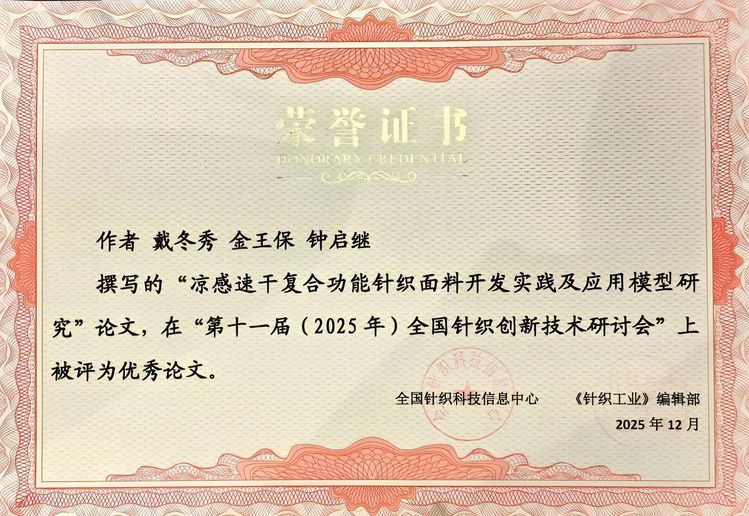 新闻网讯(通讯员吴茜)近日,由全国针织科技信息中心与北大核心期刊《针织工业》联合主办的“第十一届(2025 年)全国针织创新技术研讨会”在上海召开。期间,304永利集团官网戴冬秀团队依托企业横向项目研发的科研论文《凉感速干复合功能针织面料开发实践及应用模型研究》表现亮眼,经行业权威专家评审,荣获“优秀论文奖”。