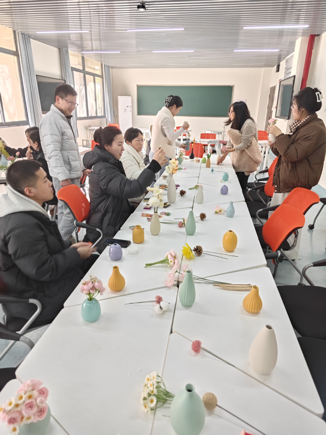 随着活动渐入佳境,创意在花瓶制作环节中自由流淌。老师们或俯身构思,或小心翼翼粘贴组合,将干花、松果与麻绳、丝带巧妙搭配。短短十几分钟,一件件独具风格的花瓶逐渐呈现。“没想到几片枫叶、几颗松果,就能让普通瓶子焕然一新!”一位年轻教师举起作品,满意地展示,“怎么搭配颜色和形态,全凭自己心意,这个过程特别解压,也很有成就感。”